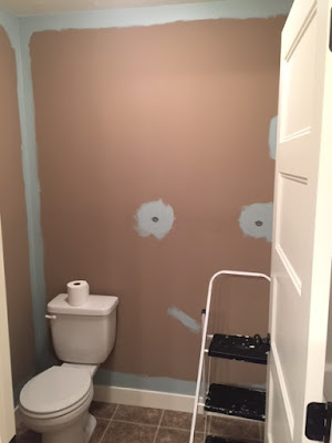 Since I have all of 3 days before our next guests arrive, why not paint the bathroom to get another thing checked off my list. Beach Glass by Benjamin Moore